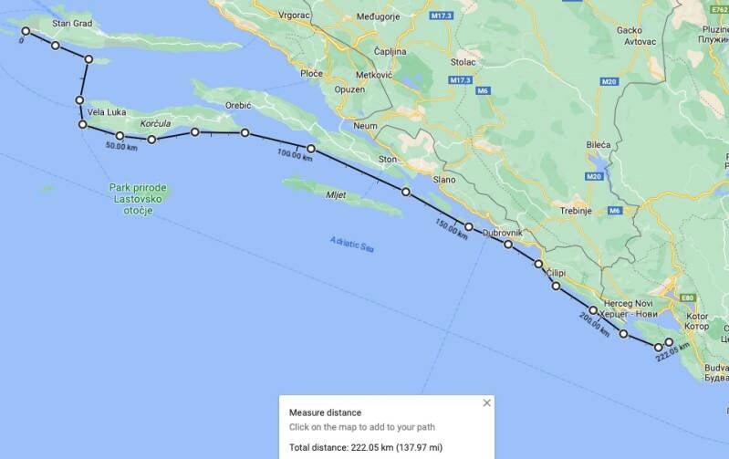 Stage 3, duration 7-10 days; length 225 km (140 miles): From the town of Hvar, along the southern side of the island of Hvar to the small island of Scedro, then crossing over to Korcula, along the southern coasts of the island of Korcula and the Peljesac peninsula, and along the mainland past Dubrovnik into Montenegro, to Herceg Novi and Lustica bay.